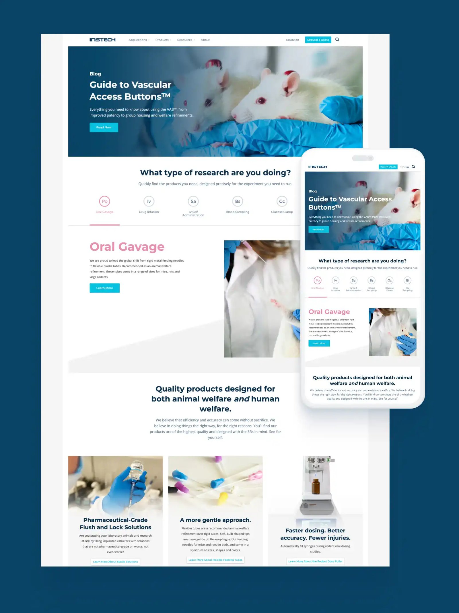 Updating the look and feel of Instech’s website as well as the technology behind the scenes has allowed them to make stronger connections with their customers, help visitors explore new products, and improve both sales efficiency and their buyer’s journey. Instech had historically struggled with how to demonstrate their important research equipment. The use of photography that abstracted the lab environment, while retaining the essential use and functionality of the equipment, was critical to bolstering the Instech brand and experience of the customer. Today, Instechlabs.com is visual, educational, and easy to navigate.