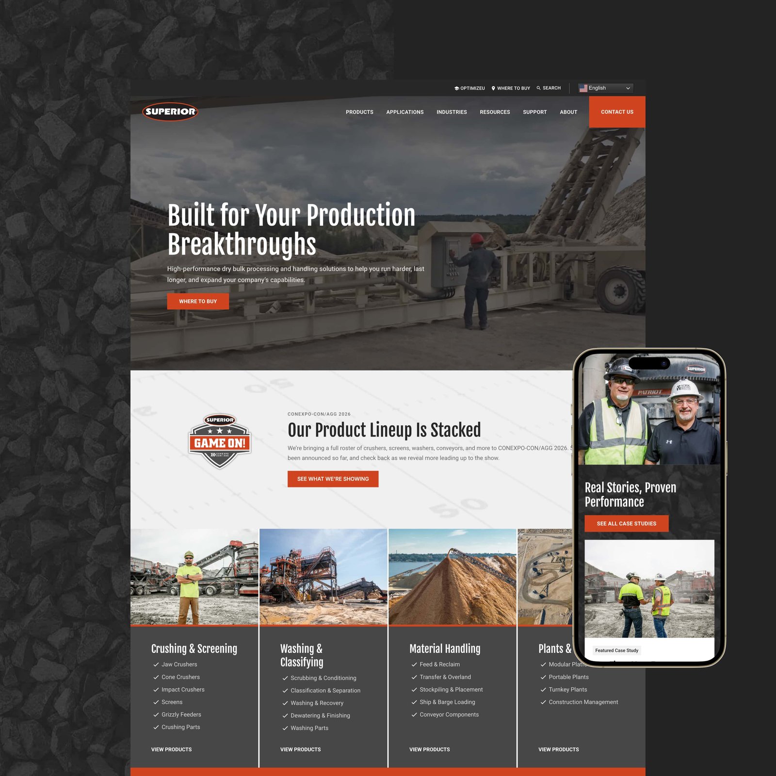 Superior Industries manufactures bulk material processing and handling equipment including conveyors, crushers, screens, and washers for demanding industrial applications. Their product catalog is extensive and technical, and their customers need to find the right equipment fast. We built a custom HubSpot CMS website with a complex product database underneath it, making it easy for buyers to navigate a deep catalog without getting lost.